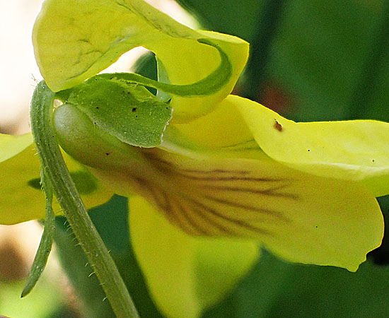 Yellow petals, lower petal with distinct purple veins near throat. Also seen are the stubby hairs on the lateral petals.