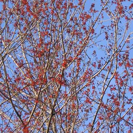 Acer rubrum, red maple, blooms in early spring - early April. This burst of red compact flower clusters can easily be seen on the bare tree tops and you know spring is coming!