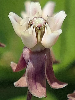 Flower structure of the common milkweed. Actually, all the milkweeds have similar structure. The petals are easily recognized.