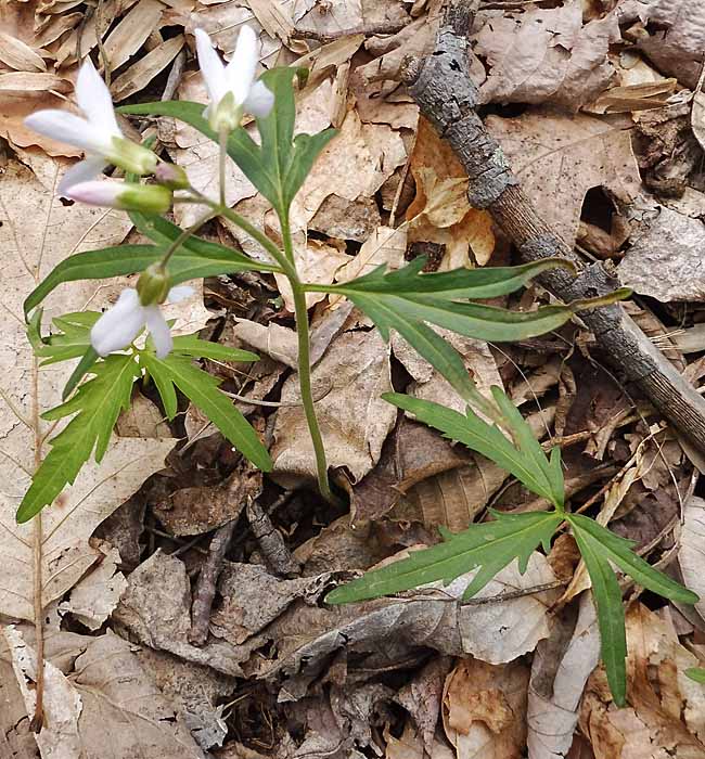 There are 4 toothwort species in NJ and the flowers are similar. It is the leaves that help distinguish between the species. Cutleaf toothwort has both rhizomal & cauline leaves. The cutleaf toothwort has deeply cut leaves and both the rhizomal and cauline leaves are similar.