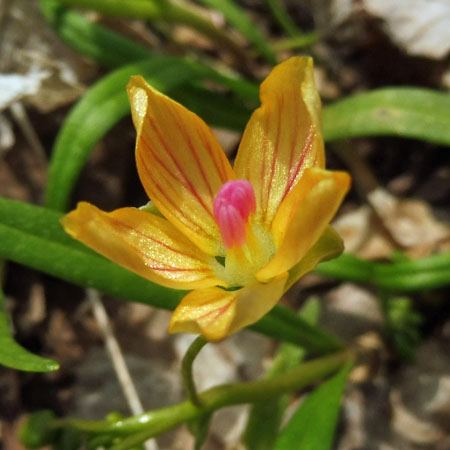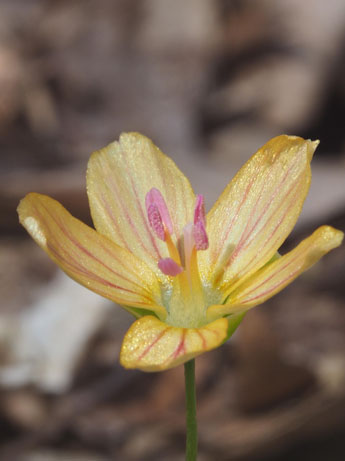 For spring beauty, Claytonia virginica, there are two varieties with yellow flowers. One is Claytonia virginica var. hammondiae, which has all yellow petal without any pink/red streaks. It is found only in limited areas of northwestern New Jersey. The other yellow-flowered variety is Claytonia virginica f. lutea, which is shown here. It has been found in Pennsylvania and Maryland.