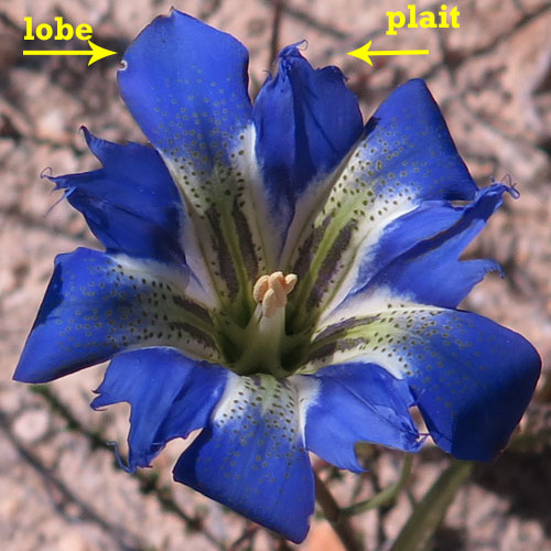 The pinebarren gentian flowers are stunning azure blue to purple but occasionally white and pale pink flowers have been observed. The tubular corolla flares usually into 5 prominent lobes; flowers have been found with 3 or 4 lobes. The lobes are spotted and the margins are smooth. In between the lobes, are floral appendages that are fringed and are lot shorter than the lobes. The floral appendages are frequently referred to as folds, plaits, pleats or secondary lobes. The relative heights/lengths of the lobes and plaits are used to distinguish between the gentian species. The pinebarren gentian flower is about 2 inches long. The calyx/sepals lobes are narrow and about 1 inch long.