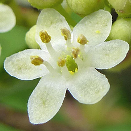 Ilex verticillata (winterberry holly) plants are almost always dioecous: plants have only male flowers or female flowers. The only way to distinguish between male and female plants is by their flowers. The individual flowers are inconspicous about a quarter inch across. They are greenish to yellowish white and form at the leaf axils along new branches. The flower stalks, pedicels, are very short. The flower parts - petals, sepals, and stamens/staminodes, are 4 to 8 numerous. The flowers appear after the leaves emerge.