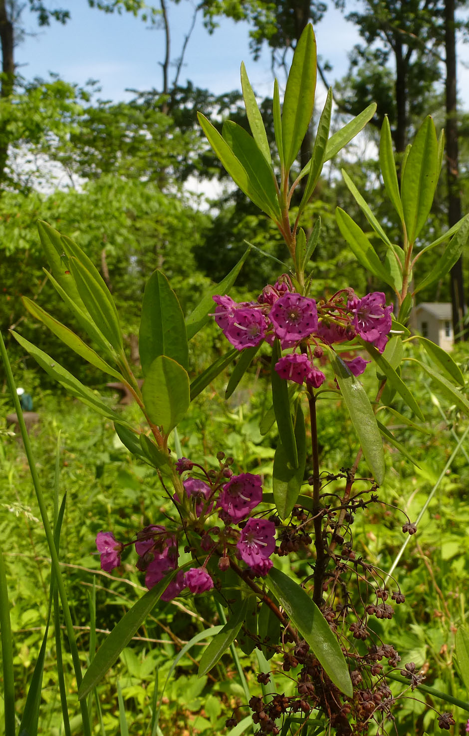 Kalmia angustifolia, sheep laurel, is a evergreen shrub 1 to 3 ft. tall with showy deep pink flowers that bloom in late spring. The plant is poisonous to animals..