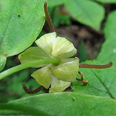The flowers stalks (pedicels) are about 1" long. The nodding flowers are about 2/3" across with 6 yellowish green recurved tepals, 6 stamens, and a 3 pronged reddish purple to brown stigma. The plant is in the lily family which has flower parts in multiples of 3. The stigmas are prominent and recurved and are as wide or wider than the width of each flower.