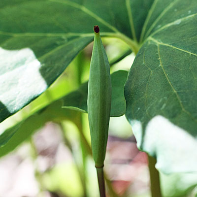 In the early spring the flower bud is wrapped by a leaf and begins to push out of the ground. The flower stem elongates and the flower bud is seen at the top of the stem with the leaf still unopened and wrapped around the lower part of the stem. The flower stalk is about 6 inches tall. After pollination, the leaves grow and expand to capture the light.