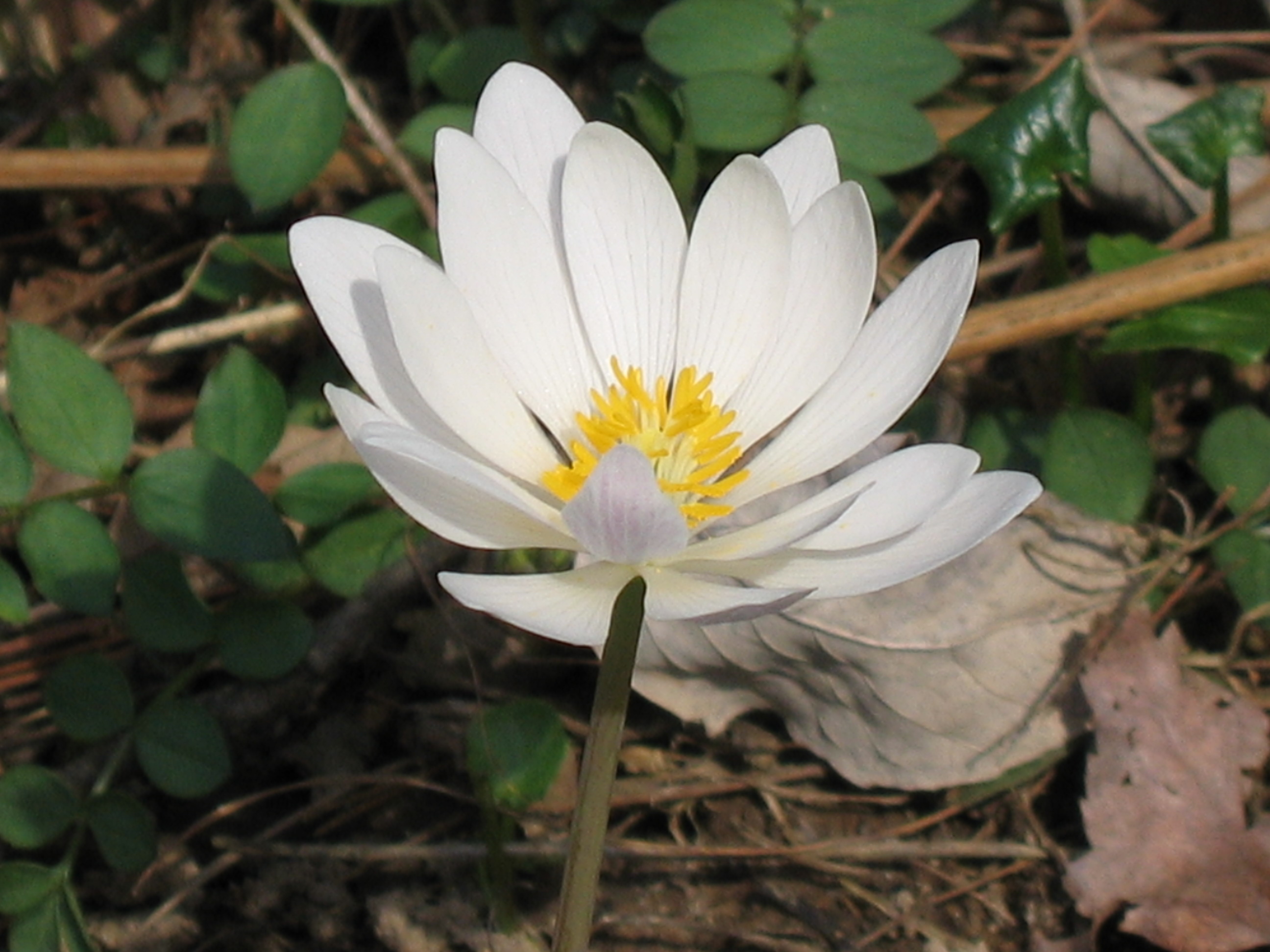 Sanguinaria canadensis, Bloodroot, is a native herbaceous perennial plant. It blooms very early in spring in deciduous woods when most plants have not begun to leaf out. It is hard not to spot these awesome white flowers against a backdrop of brown leaf mulch.