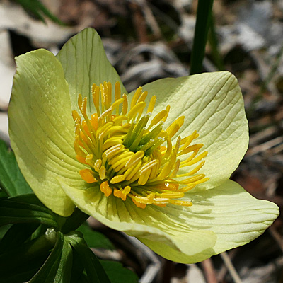 The flowers are produced singly on the top of a stem. The yellow/cream colored flowers are up to 2 inches across and are shallow bowl-shaped. What looks like petals are actually yellow colored sepals, 5-7 of them. The 10 to 15 petals are modified yellow to orange short stubby structures with nectaries at the base. Sometimes these modified petals are referred to as staminodes. There are numerous stamens (20-80) and 5-28 individual pistils in the center.